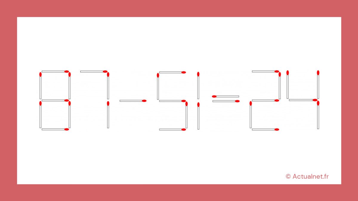 - Ajoutez cette même allumette au chiffre 1 du nombre 51 (deuxième terme de l’équation) pour former un 7.